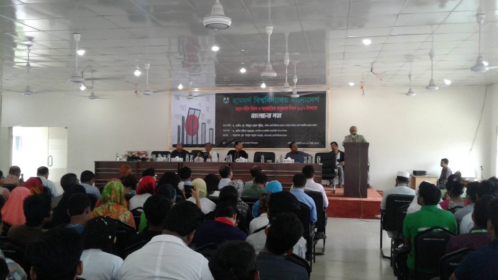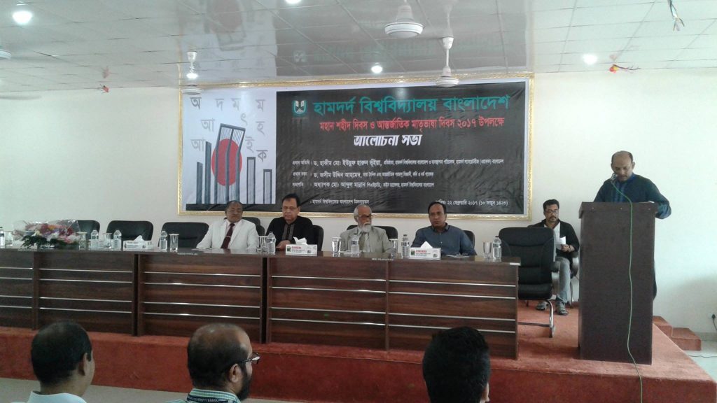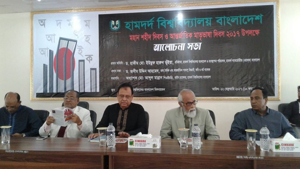 Hamdard University Bangladesh organized a discussion meeting on “Mohan Shahid Dibos & International Mother Language Day” on 22 February 2017 in the Multipurpose Hall of the University at Hamdard City of Science, Education and Culture, Gazaria, Munshiganj. The honorable Founder of the University Dr. Hakim Mohammad Yousuf Harun Bhuiyan was the chief guest and language fighter, international nuclear scientist, poet and religion researcher Dr. Jashim Uddin Ahmed was the keynote Speaker. Among others, member of the Board of Trustees Lt. Colonel Mahbubul Alam Chowdhury, Registrar of the University Md. Lutfur Rahman, Controller of Examinations Md. Nurul Huda, all Deans of the Faculties along with their faculty members and students of the University were present at the program. The Vice Chancellor Professor Md. Abdul Mannan PhD presided the program.