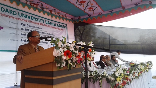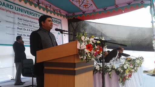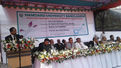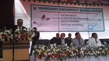 Hamdard University Bangladesh hosted freshers reception of spring semester and 1st professional BUMS/BAMS 2017 and guardians convention on 15 January 2017 at its permanent campus at Hamdard City of Science, Education and Culture, Gazaria, Munshiganj. The honorable Chairman of the Board of Trustees (BOT) of Hamdard University Bangladesh Mr. Kazi Golam Rahman graced the occasion as the Chief Guest while the Founder of the University Dr Hakim Md. Yousuf Harun Bhuiyan and the Vice-Chairman of the BOT Prof Dr A. K Azad Khan were present as special guests.