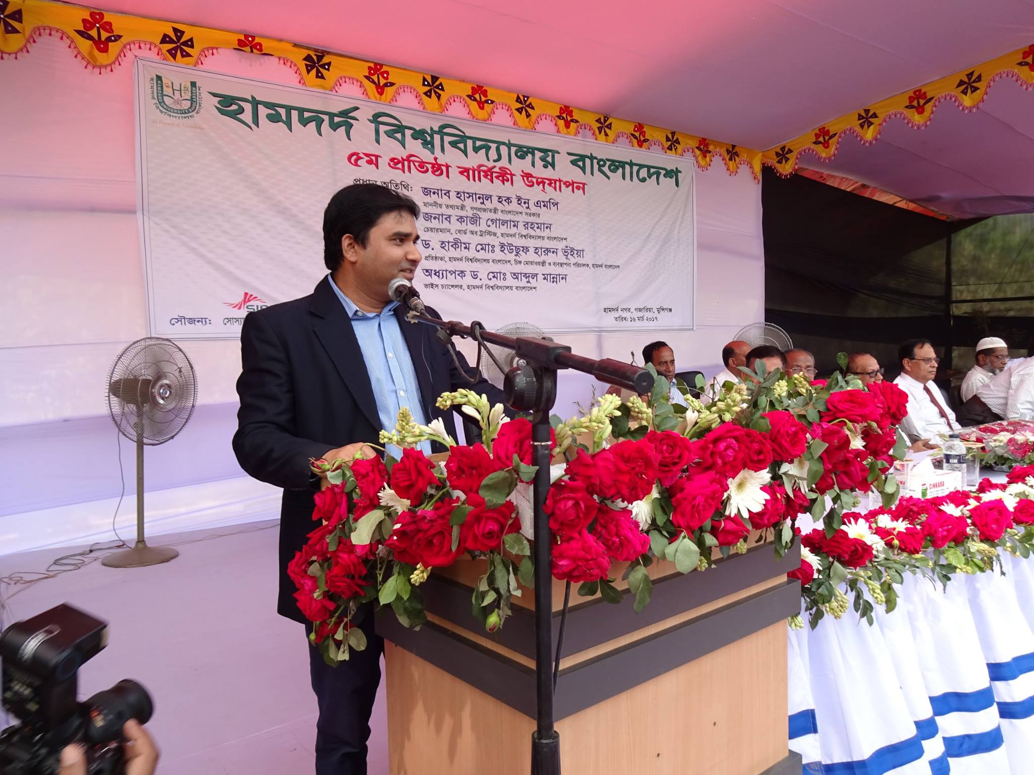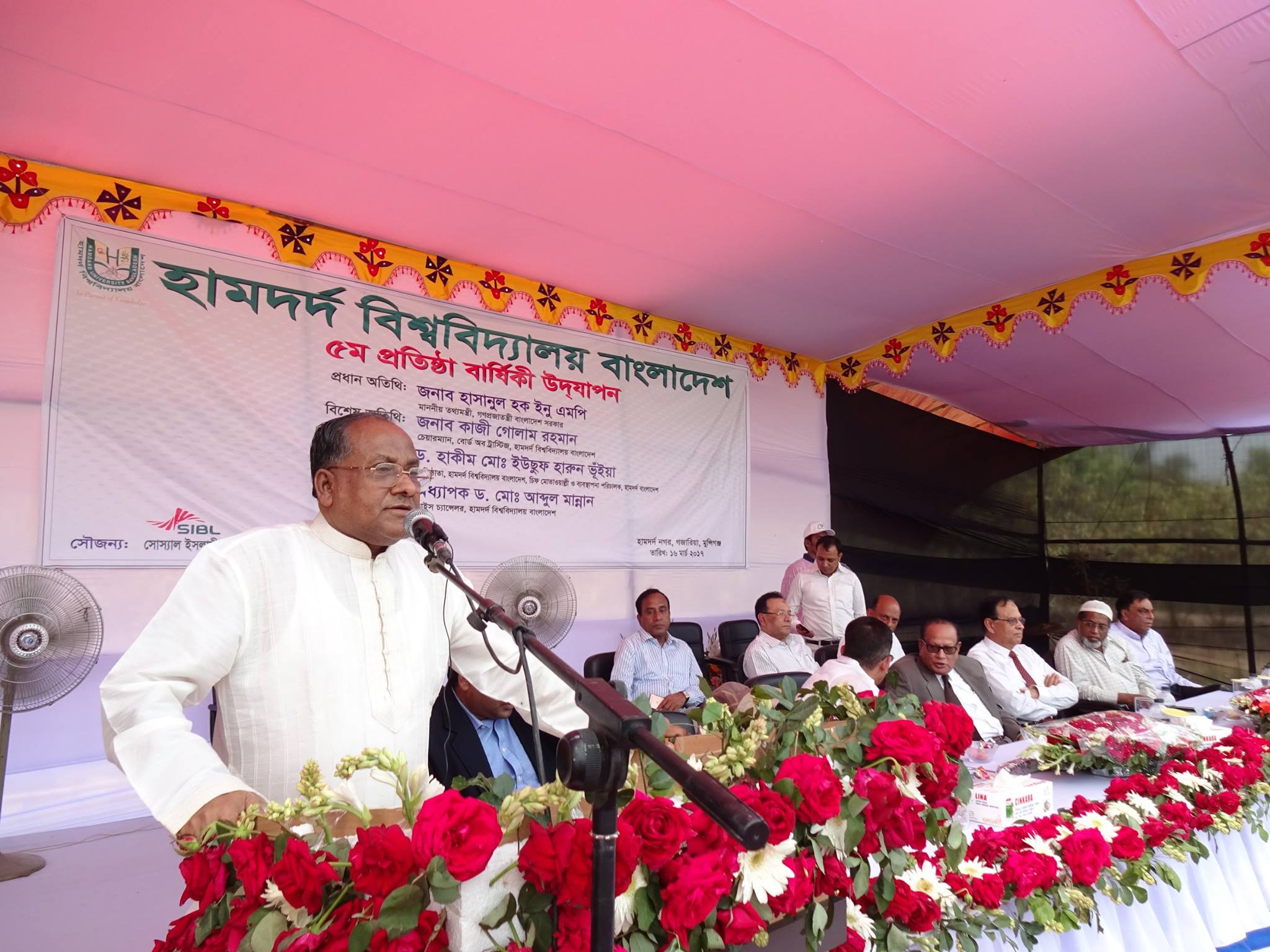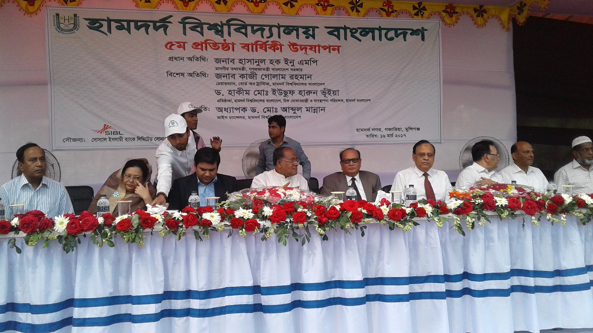 Hamdard University Bangladesh celebrated its 5th Foundation Day on 16 March 2017 on its campus at Hamdard City of Science, Education and Culture, Gazaria, Munshiganj. Hamdard University Bangladesh was established on 14 March 2012. The Chairman of the Board of Trustees (BOT) of the University Kazi Golam Rahman was the Chief guest while the Founder of the University Dr. Hakim Mohammad Yousuf Harun Bhuiyan was present as special guest at the occasion. The Vice Chancellor Professor Md. Abdul Mannan PhD presided the program. Among other dignitaries, members of the Board of Trustees Prof Hakim shiry Farhad, Lt. Colonel Mahbubul Alam Chowdhury, Mohammad Zamal Uddin (Russell), member of the syndicate of the University Prof Dr Emran Kabir Chowdhury, Registrar of the University Md. Lutfur Rahman, Controller of Examinations Md. Nurul Huda, all Deans of the Faculties along with their faculty members and students of the University were present at the program. The program started with the recitation of the Holy Quran, the Holy Bhagabat Geeta and national anthem respectively.