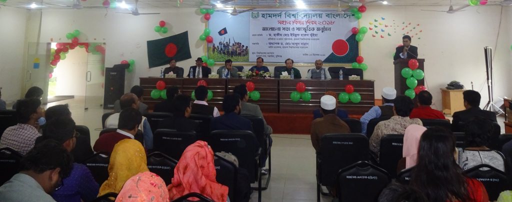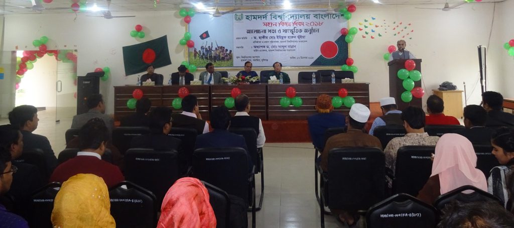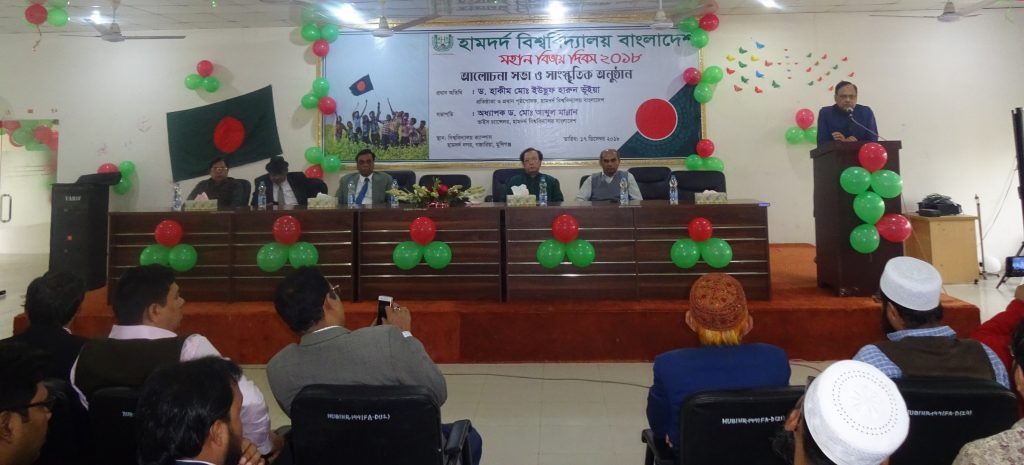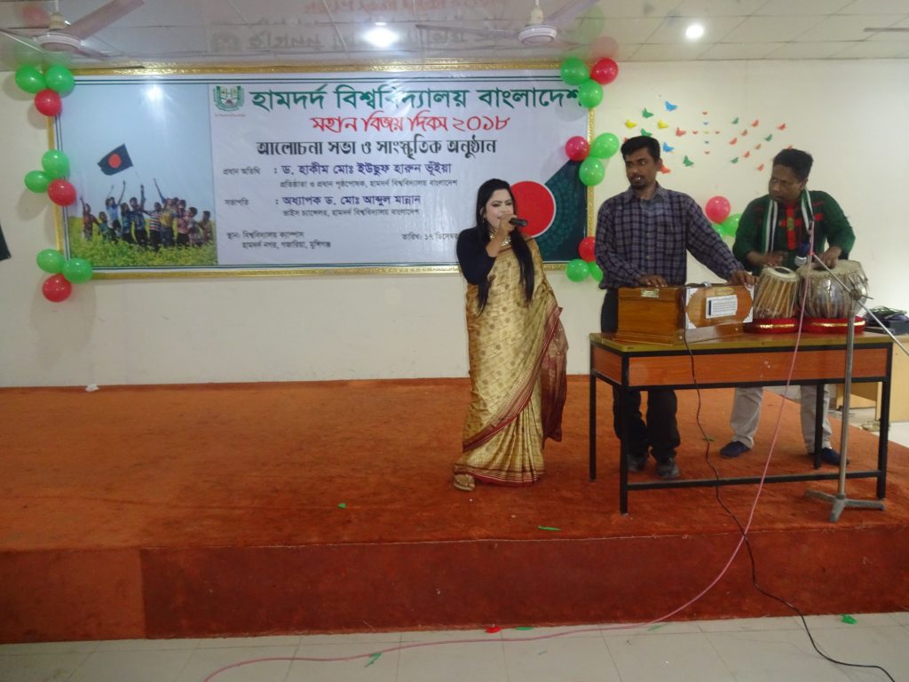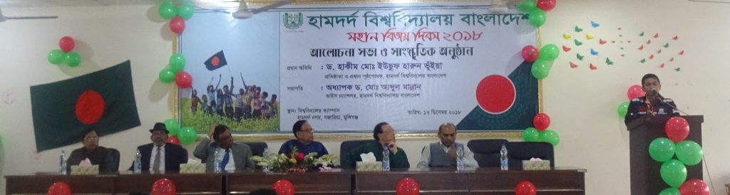 On 17 December 2018 Hamdard University Bangladesh organized a discussion meeting and cultural program on the Victory Day at the permanent campus, Hamdard Nagar, Gazaria, Munshiganj. The Vice Chancellor of the University Prof Dr Md. Abdul Mannan was the Chief guest while Prof. Dr. Mohammad Sadirul Islam, Dean, Faculty of Arts and Social Sciences; Assoc. Prof. Dr. Mohallad Rabiul Alam, Dean (In-charge), Faculty of Sciences, Engineering and Technology; Md. Nurul Huda, the Controller of Examinations and the Registrar (In-charge); all the Heads of the Departments, all faculty members, Officers, students and staff were present at the program. Prof. Dr. Md. Nasim Anzum; Dean, Faculty of Business Administration presided over the program.