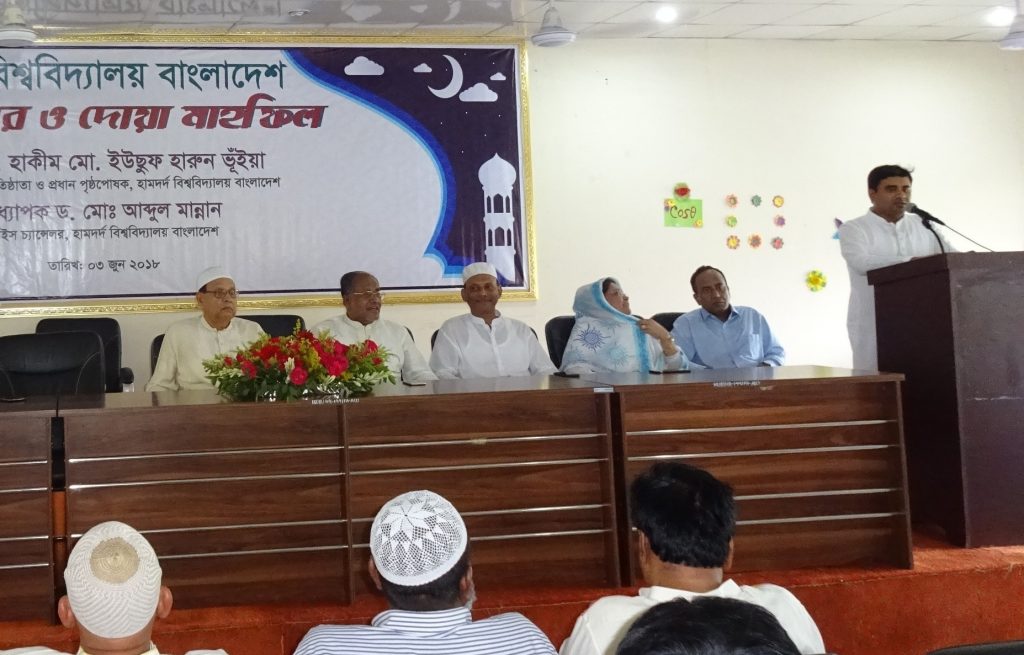 Hamdard University Bangladesh organized an Iftar and Doa Mahfil on 03 June 2018 at its permanent campus at Hamdard City of Science, Education and Culture, Gazaria, Munshiganj-1510. The honorable Founder and Chief patron of Hamdard University Bangladesh Dr. Hakim Mohammad Yousuf Harun Bhuiyan was present as the Chief guest in the event and graced the occasion. The Vice Chancellor of the University Prof. Md. Abdul Mannan PhD presided over the program while Member of the Board of Trustees Mohammad Zamal Uddin (Russell), Md.Anisul Hoque, Prof. Hakim Shiry Farhad, Lt. Colonel Mahbubul Alam Chowdhury (Retd.), the Registrar of the University Md. Lutfur Rahman, the Controller of Examinations Md. Nurul Huda, all Deans of the Faculties along with their Faculty members, officers, students and staffs were present.
