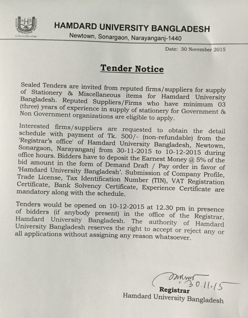 Tender Notice November 11, 2015 Category: Academics, News Leave a comment Your technical and financial proposals are to be submitted in below email. tender@hamdarduniversity.edu.bd